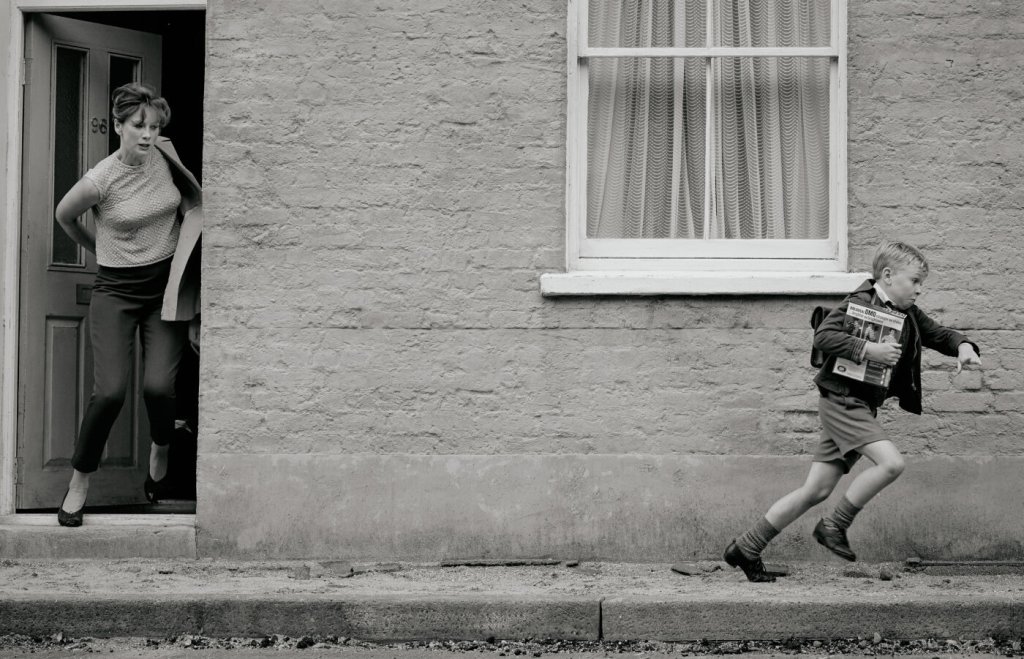 Commencing with a colour introduction of modern Belfast, the camera’s gaze slowly traverses to a terraced street and fades to monochrome, a palette which remains for most of the running time. Later as the family attends the local cinema, colour creeps back in, only highlighting the black and white existence, in every sense, the family lead.